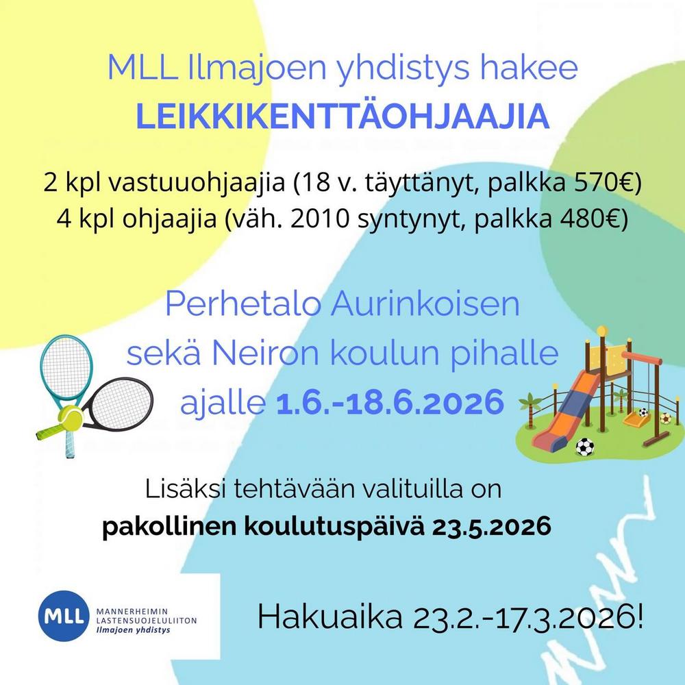 MLL Ilmajoki järjestää perinteiseen tapaan leikkikenttätoimintaa ajalla 1.-18.6.2026.